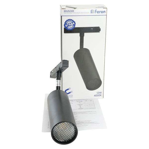 Черный поворотный трековый LED светильник 48В Ферон мощностью 12Вт для магнитного шинопровода, нейтральный белый свет с углом рассеивания 35 градусов и антибликовой решеткой 48920