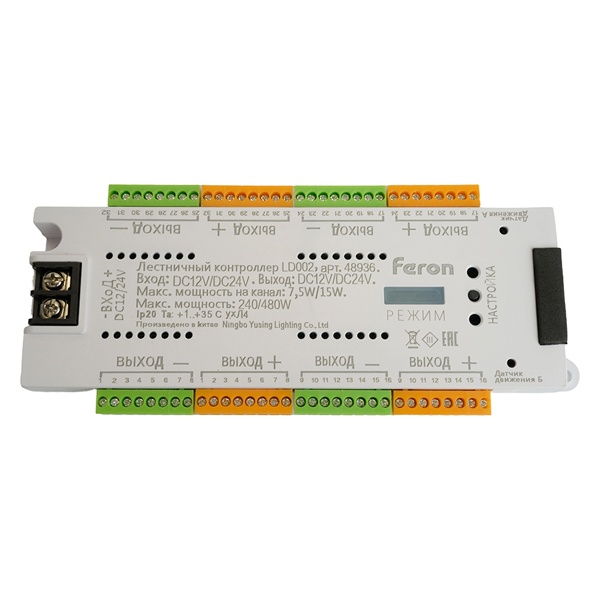 Контроллер LD002 предназначен для автоматической подсветки лестничных ступеней с использованием одноцветной светодиодной ленты напряжением 12 В или 24 В. Устройство обеспечивает удобное и безопасное освещение лестницы в тёмное время суток, создавая эффект плавного и последовательного включения подсветки.