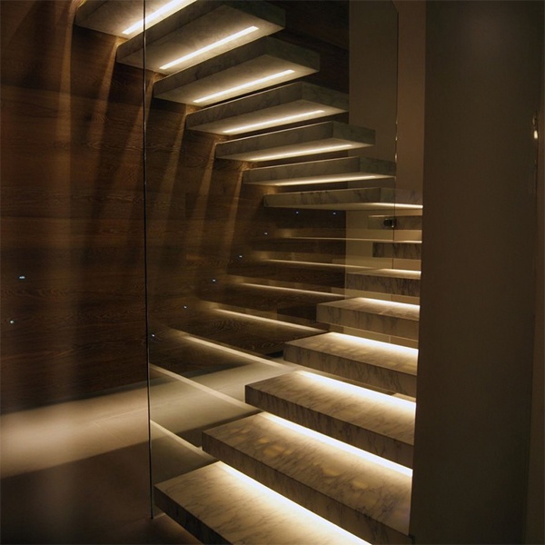 Работа контроллера осуществляется совместно с датчиками движения. При срабатывании одного из датчиков светодиодные ленты, установленные на ступенях, поочерёдно и плавно включаются с заданной скоростью, обеспечивая комфортное и эстетичное освещение.