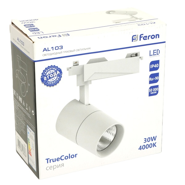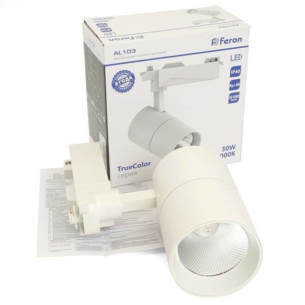 Белый трековый однофазный светодиодный светильник AL103 Ферон, мощность 30Вт, нейтральный белый свет с углом рассеивания 35 градусов 48941