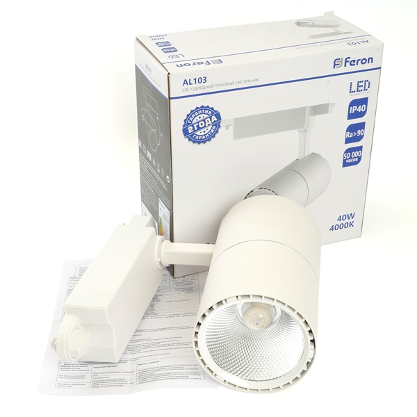 Белый трековый однофазный светодиодный светильник AL103 Ферон, мощность 40Вт, нейтральный белый свет с углом рассеивания 35 градусов 48943