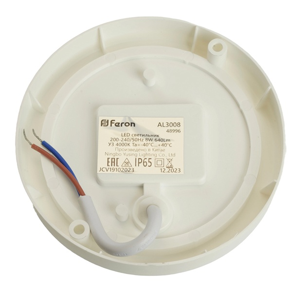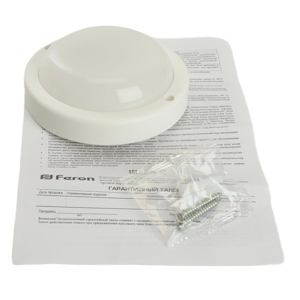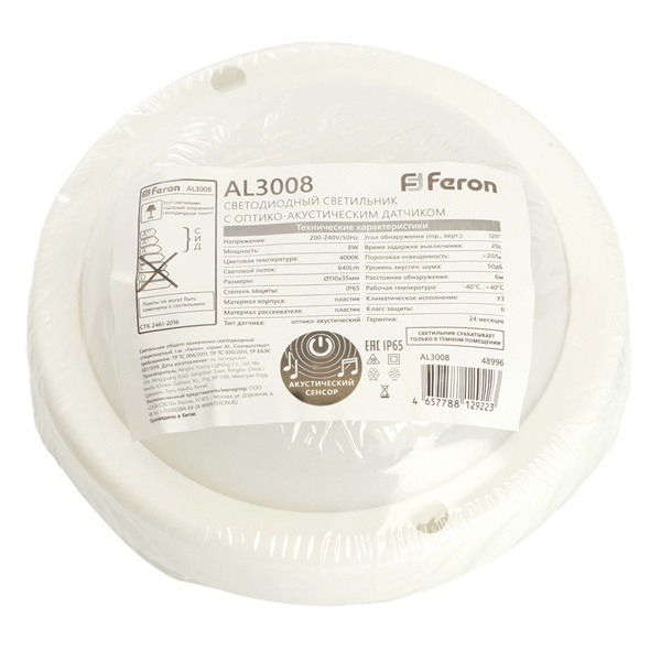 Круглый пылевлагозащищённый накладной LED светильник мощностью 8 Ватт, нейтральный белый свет, c оптико-акустическим датчиком, Ферон 48996