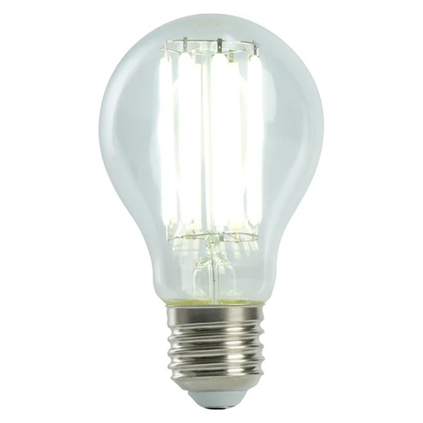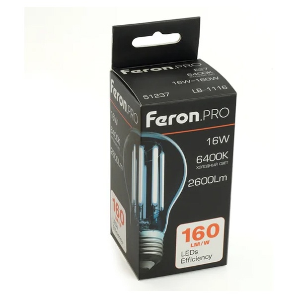 Филаментная лампочка Ферон с нитевидными светодиодами, мощностью 16 Ватт, с цоколем E27, холодный дневной свет, прозрачная колба 51237