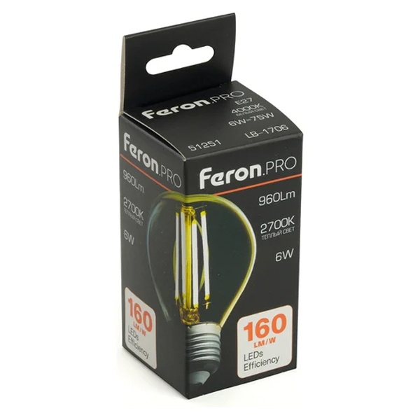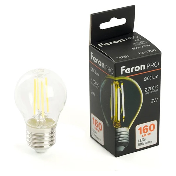 Филаментная лампочка шарик Ферон с нитевидными светодиодами, мощностью 6 Ватт, с цоколем E27, теплый свет, прозрачная колба 51250