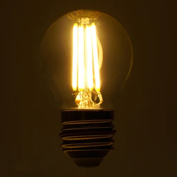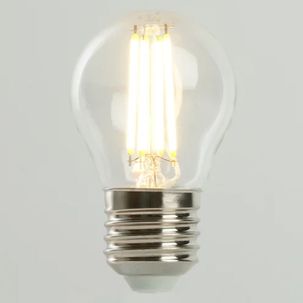 Филаментная лампа шарик с нитевидными светодиодами - это энергоэффективный и стильный источник света, который сочетает в себе традиционный дизайн и новейшую технологию светодиодов. Лампочка имеет форму шарика, изготовлена из прозрачного стекла и имеет светодиодный нитьевидный элемент внутри.