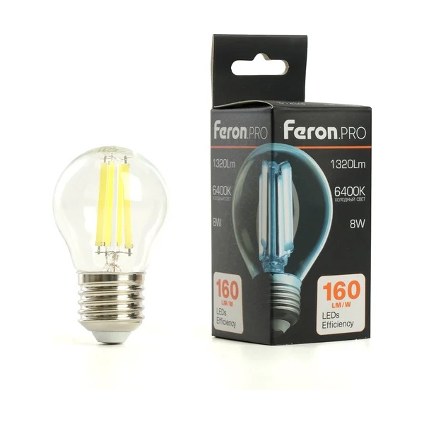 Филаментная лампочка шарик Ферон с нитевидными светодиодами, мощностью 8 Ватт, с цоколем E27, холодный дневной свет, прозрачная колба 51255