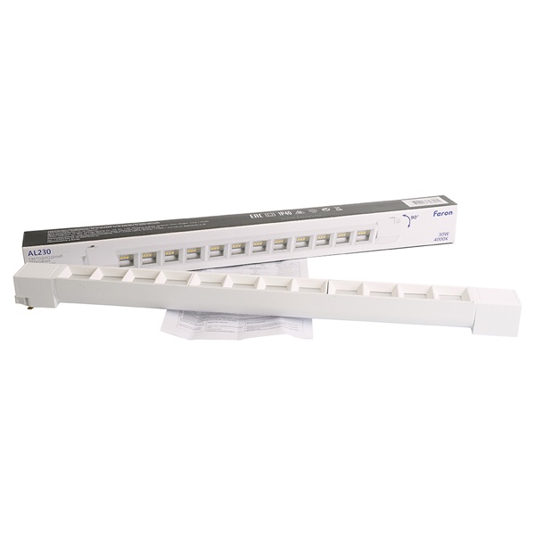 Трековый светодиодный светильник Feron AL230 представляет собой современный линейный светильник, предназначенный для установки на трековую систему освещения. Он оснащён высококачественными линзами, обеспечивающими фокусировку светового потока с углом раскрытия 60°, что позволяет создавать направленное и акцентное освещение.