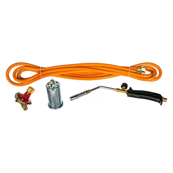 широкая насадка для термоусадки с диаметром сопла 50 мм, обеспечивающая равномерный прогрев больших поверхностей;узкая насадка для пайки с диаметром сопла 17 мм, позволяющая точно и аккуратно работать с мелкими деталями;редуктор для стабильной подачи газа и безопасной эксплуатации;шланг высокого давления длиной 5 метров, обеспечивающий свободу перемещения и удобство работы на расстоянии от баллона.