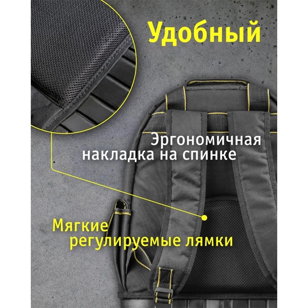 Ударопрочное резиновое дно с высокими бортиками обеспечивает надежную защиту содержимого от влаги, грязи и механических повреждений, а также придает рюкзаку устойчивость на неровных поверхностях.Прочный водоотталкивающий материал Oxford 600D эффективно предохраняет инструменты и электромонтажные принадлежности от влаги и загрязнений.Жесткая конструкция дна сохраняет форму рюкзака даже при значительной нагрузке.Множество внутренних и наружных карманов позволяют удобно и аккуратно разместить все необходимые инструменты, аксессуары и расходные материалы.Универсальная конструкция дает возможность носить рюкзак как на плечах (за удобные регулируемые лямки), так и в руке — с помощью усиленных ручек.Эргономичная спинка и плечевые ремни обеспечивают комфорт даже при длительном ношении.Дополнительные петли и крепления позволяют фиксировать инструмент или навесное оборудование снаружи рюкзака.