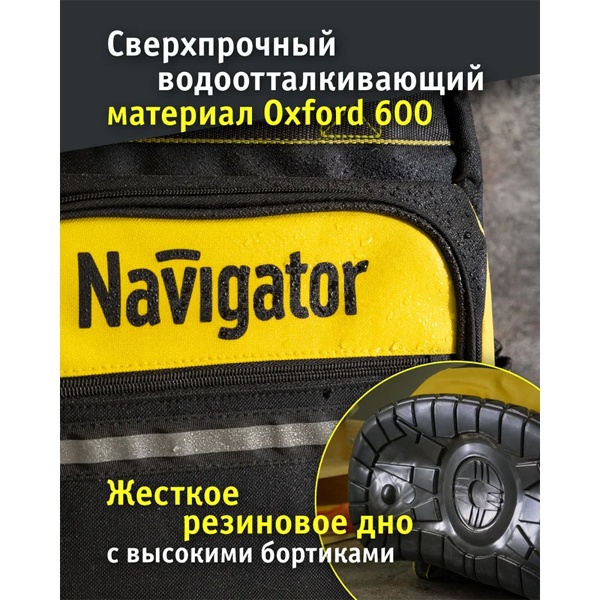 Navigator NTA-Bag03 — прочный и вместительный рюкзак с резиновым дном, предназначенный для переноски и хранения монтажных принадлежностей, ручного инструмента и средств индивидуальной защиты.