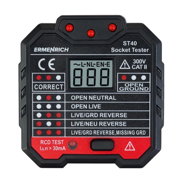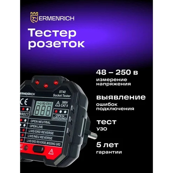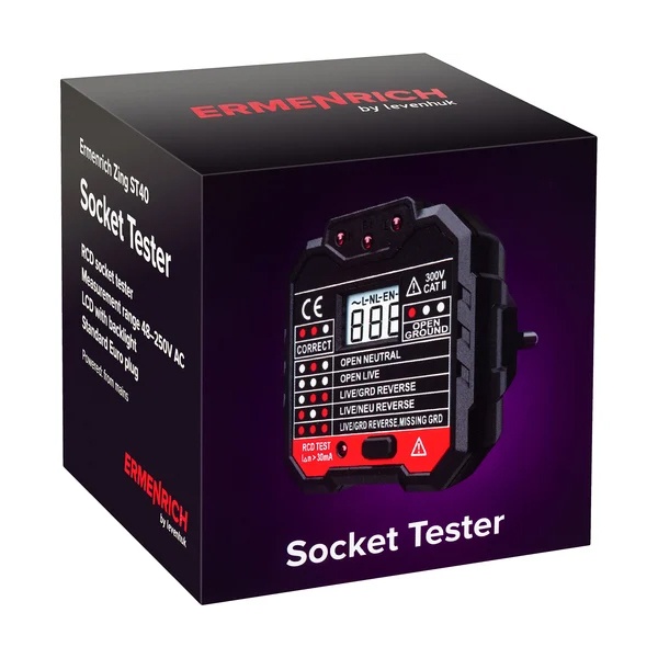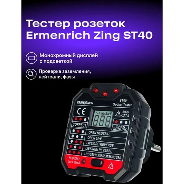 Ermenrich Zing ST40 — это современный и удобный тестер розеток с евровилкой, оснащённый ЖК-экраном с подсветкой и функцией проверки работоспособности устройства защитного отключения (УЗО). Прибор позволяет проверить правильность подключения розетки, измерить величину напряжения и убедиться в корректной работе УЗО, что делает его полезным как для профессионалов, так и для домашних мастеров.