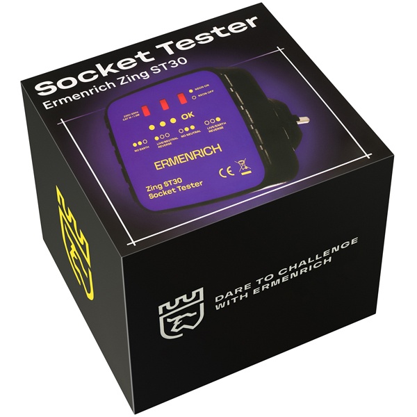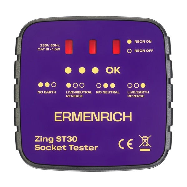 Ermenrich Zing ST30 — это компактный и удобный прибор для быстрой проверки розеток на корректность подключения и наличие напряжения. Он одинаково полезен как для профессиональных электриков, так и для домашних мастеров благодаря простому и интуитивно понятному управлению.
