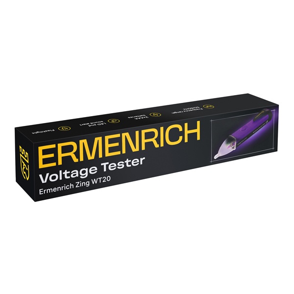 При обнаружении напряжения прибор издаёт звуковой сигнал и загорается красный светодиод в зоне сенсора. Чувствительность устройства охватывает диапазон от 60 до 1000 В. Ermenrich Zing WT20 соответствует всем необходимым стандартам безопасности и отличается простотой в использовании. Работать с ним можно в широком температурном диапазоне — от –10 до +50°C.