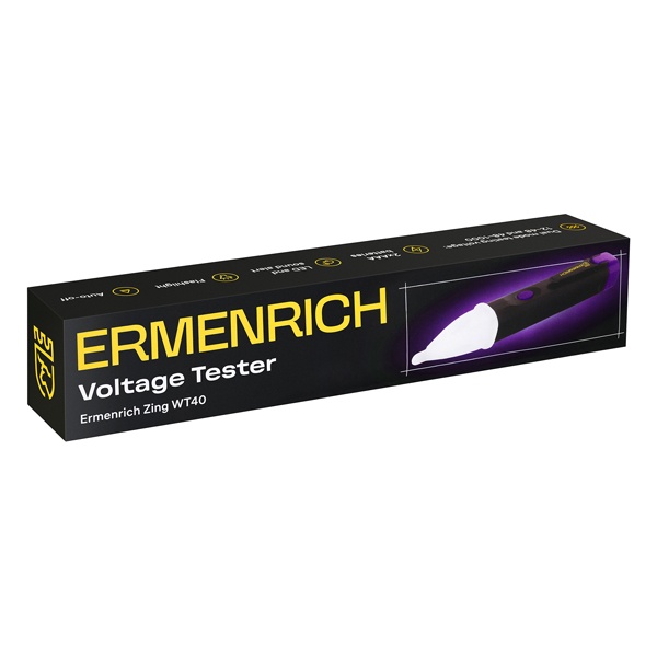 Ermenrich Zing WT40 — это бесконтактный индикатор переменного напряжения, предназначенный для диагностики розеток и электрических кабелей. Устройство поддерживает два режима оповещения: для сетей с напряжением 12–48 В и 48–1000 В. В первом случае индикатор подаёт низкочастотный звуковой сигнал, сопровождаемый мигающим красным светодиодом. При более высоком напряжении звучит резкий сигнал, а диод светится непрерывно.
