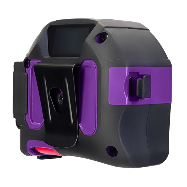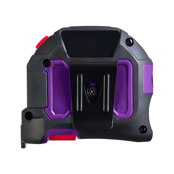 Корпус выполнен из прочного ABS-пластика и покрыт резиновым слоем, что обеспечивает комфортный хват и предотвращает выскальзывание из рук. Для удобства переноски на корпусе предусмотрено поясное крепление, позволяющее закрепить рулетку на одежде или инструментальном поясе.