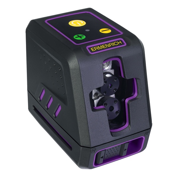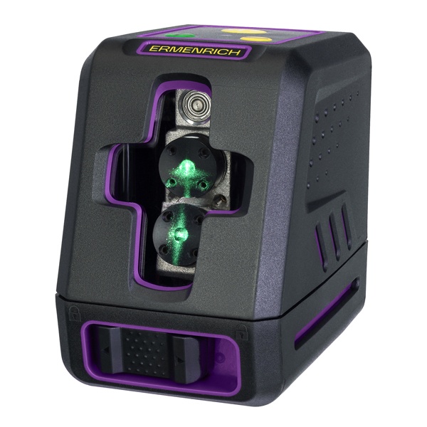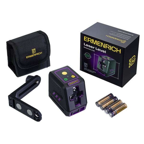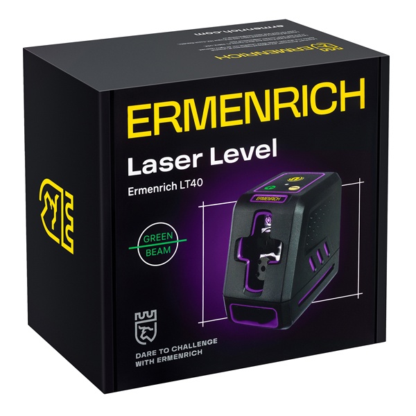 Уровень Ermenrich BASE LT40 оснащен светодиодами и производит две линии: одну по горизонтали, вторую – по вертикали. Лучи зеленого цвета имеют регулировку яркости в пределах 10 степеней. Угол развертки каждого из лучей равен 130 как по вертикали, так и по горизонтали. Прибор подходит для строительных и ремонтных работ в больших пространствах: его луч достигает длины 30 м. Линии самостоятельно выравниваются благодаря встроенному в уровень механизму компенсации.
