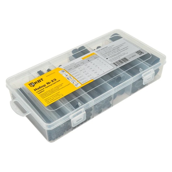 • Набор термоусадочных трубок КВТ №23 (черный, прозрачный) в органайзере в нарезке по 100мм 3:1