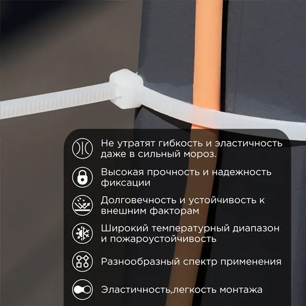 Морозостойкая нейлоновая стяжка REXANT — это универсальное крепежное решение, идеально подходящее для использования при экстремально низких температурах до -60°C. Она предназначена для надежного закрепления кабелей и проводов на улице в зимний период, а также для фиксации различных строительных материалов. Кроме того, стяжка отлично справляется с креплением гирлянд, фонарей, акриловых фигурок и других праздничных украшений. Благодаря высокой морозостойкости, стяжка сохраняет свою прочность даже в сильные холода, обеспечивая долговечную и надежную фиксацию вне зависимости от погодных условий.