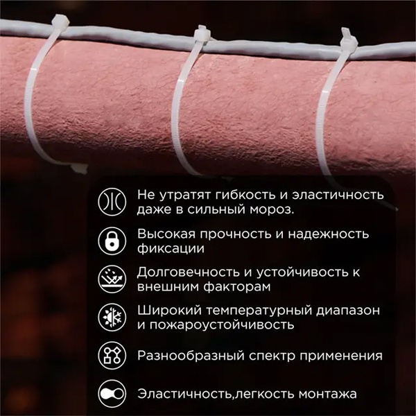 Морозостойкая нейлоновая стяжка REXANT — это универсальное крепежное решение, идеально подходящее для использования при экстремально низких температурах до -60°C. Она предназначена для надежного закрепления кабелей и проводов на улице в зимний период, а также для фиксации различных строительных материалов. Кроме того, стяжка отлично справляется с креплением гирлянд, фонарей, акриловых фигурок и других праздничных украшений. Благодаря высокой морозостойкости, стяжка сохраняет свою прочность даже в сильные холода, обеспечивая долговечную и надежную фиксацию вне зависимости от погодных условий.