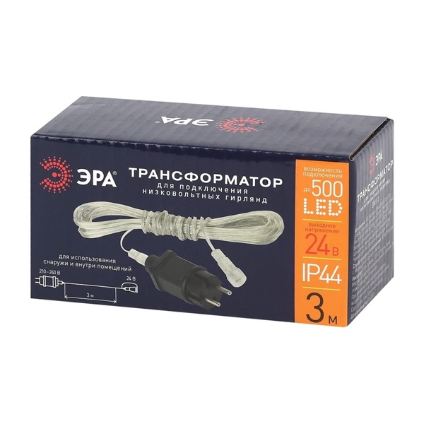 Трансформатор подходит для использования как снаружи, так и внутри помещений. Он защищён от влаги и пыли по международному индексу IP44. С его помощью к стандартной электросети подключается даже большая новогодняя гирлянда с 1000 светодиодными лампами. Преобразует входное напряжение 210-240 В в выходное 24 В. Изготовлен из меди и поливинилхлорида, не поддерживающего горение. Позволяет наращивать длину гирлянды на 3 метра. Это даёт возможность использовать гирлянду на значительном расстоянии от питающей сети.