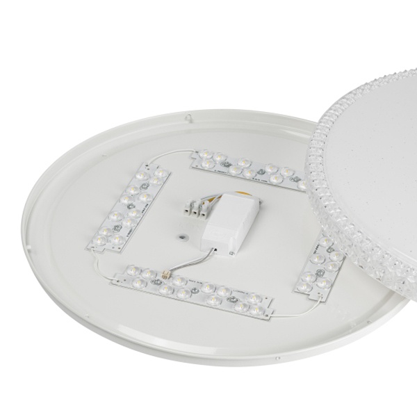 Классическая круглая форма плафона гармонично сочетается с различными стилями интерьера - от минимализма до современного классического оформления. Матовый рассеиватель обеспечивает мягкое и равномерное распределение светового потока, устраняя резкие тени и предотвращая появление бликов, что делает освещение комфортным для глаз даже при длительном пребывании в помещении.