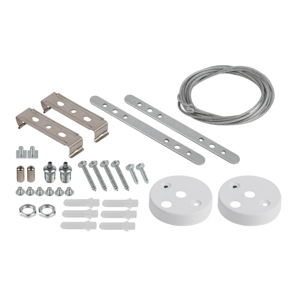 В монтажный набор включены два комплекта креплений: для накладной установки и для подвесного монтажа. В комплекте — трос длиной 1 м и шнур питания длиной 1 м, что обеспечивает удобство при проектировании и установке.