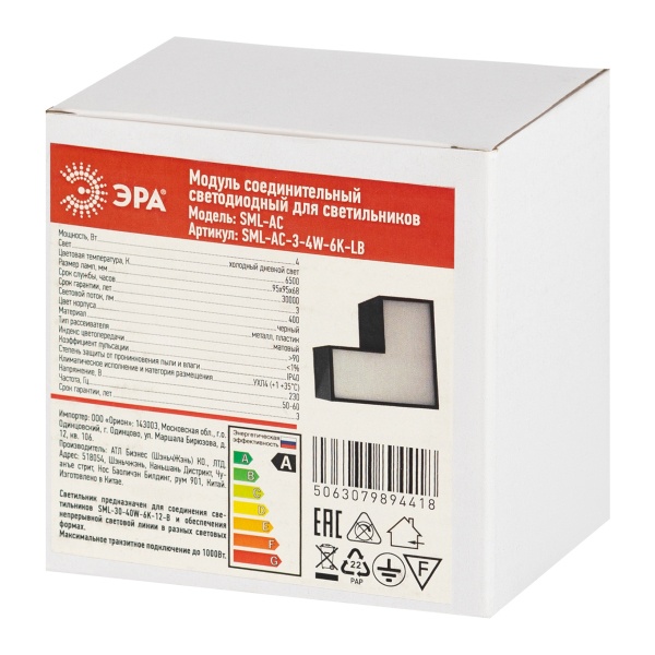 Соединительный L-образный LED светильник 4Вт, ЭРА SML-30 черного цвета, холодный белый свет Б0069434