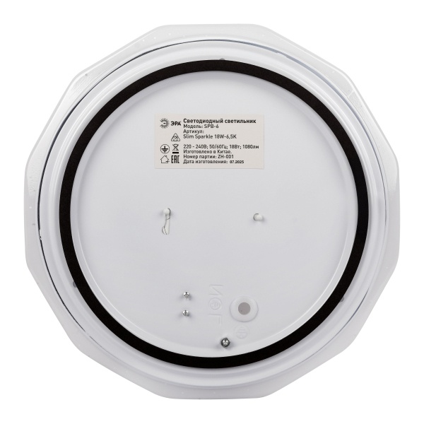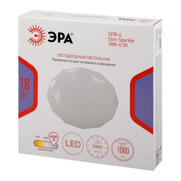 Светодиодный светильник ЭРА SPB-6 Slim Sparkle — современный вариант для организации общего освещения в жилых и коммерческих помещениях. Благодаря компактным размерам 190x55 мм модель отлично подходит для комнат с невысокими потолками. Степень защиты IP20 позволяет использовать светильник в сухих внутренних пространствах, а оригинальная форма плафона гармонично сочетается с различными стилями интерьера.Мощность устройства составляет 18 Вт, при этом световой поток достигает 1080 лм, обеспечивая достаточную яркость для повседневного освещения. Матовый рассеиватель способствует мягкому и равномерному распределению света без бликов и зрительного дискомфорта.Нейтральная цветовая температура 6500 К создаёт комфортную атмосферу как для работы, так и для отдыха. Светильник эффективно освещает площадь до 5 м2. Встроенные светодиоды отличаются экономичным энергопотреблением, стабильной работой без мерцания и длительным сроком службы — до 30 000 часов.Модель проста в установке, не требует дополнительного обслуживания и подходит для использования в качестве основного или дополнительного источника света. ЭРА SPB-6 Slim Sparkle объединяет современный дизайн, надёжность и энергоэффективность, что делает его практичным выбором для квартир, офисов, торговых и подсобных помещений.