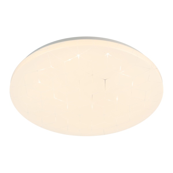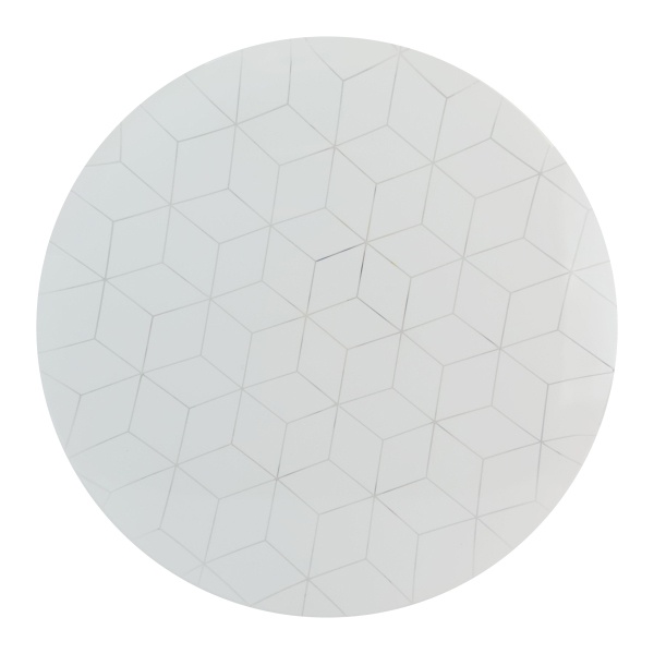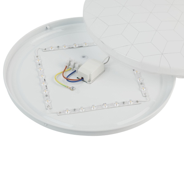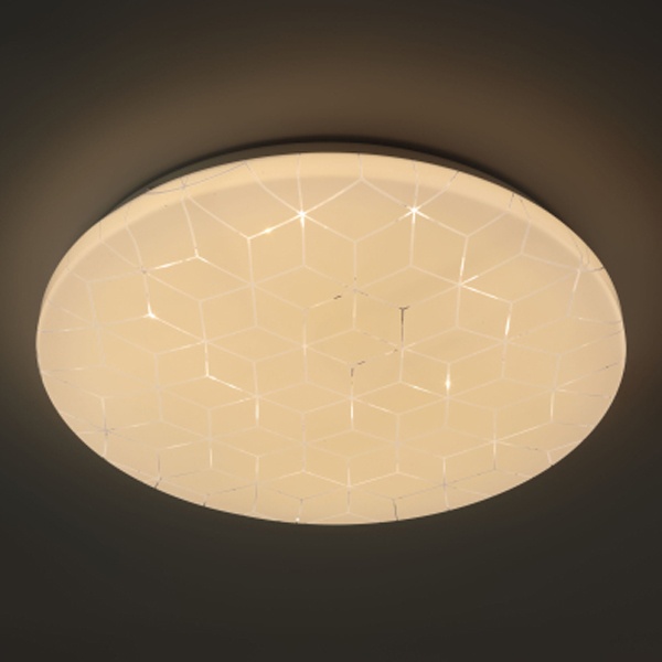 Особенностью модели является оригинальный геометрический рисунок на плафоне, который деликатно подсвечивается при включении, создавая легкий декоративный акцент и добавляя интерьеру выразительности. Светильник органично впишется в современные стили — минимализм, хай-тек, модерн.