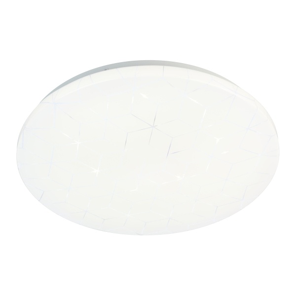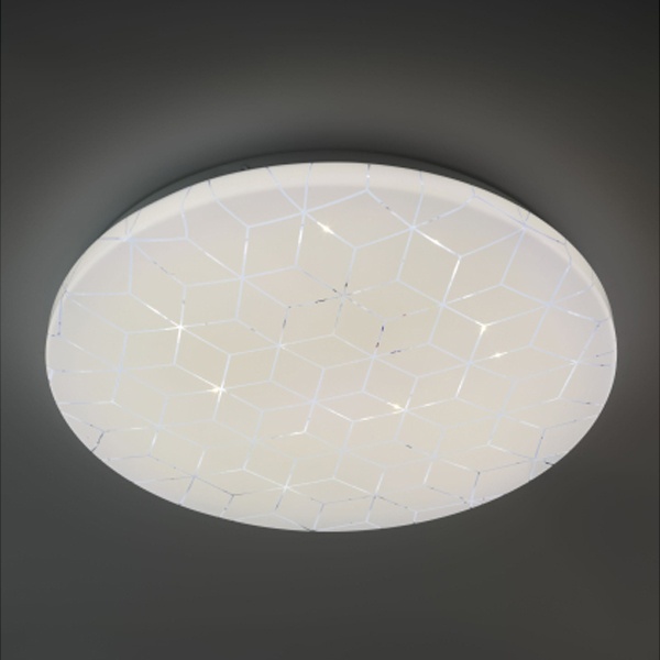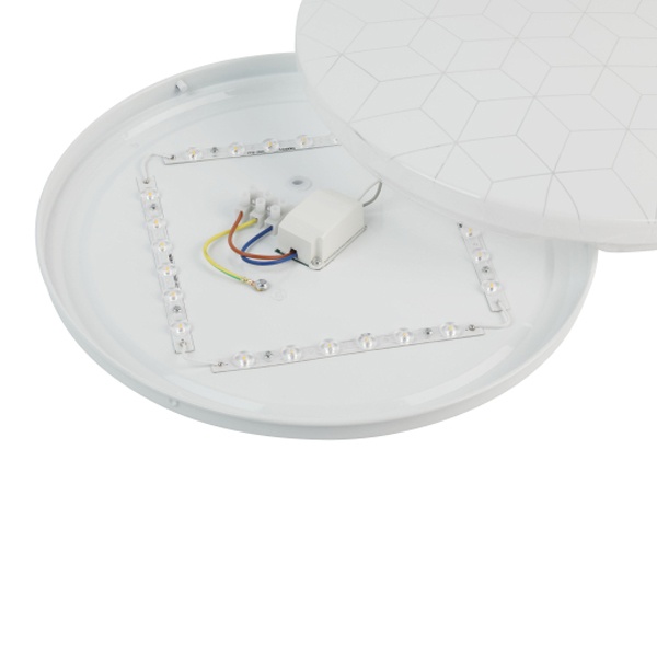 Особенностью модели является оригинальный геометрический рисунок на плафоне, который деликатно подсвечивается при включении, создавая легкий декоративный акцент и добавляя интерьеру выразительности. Светильник органично впишется в современные стили — минимализм, хай-тек, модерн.