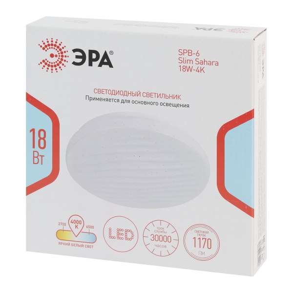 Светодиодный светильник ЭРА SPB-6 Slim Sahara — стильное и практичное решение для освещения жилых и коммерческих пространств. Компактный корпус размером 210x50 мм позволяет устанавливать модель даже в помещениях с невысокими потолками. Степень защиты IP20 предусматривает использование в сухих внутренних зонах.Рельефный плафон с эффектом «звёздного неба» придаёт светильнику выразительность и создаёт мягкую декоративную игру света, гармонично дополняя различные интерьерные стили. При мощности 18 Вт устройство формирует световой поток 1170 лм, обеспечивая достаточную яркость для повседневных задач. Матовый рассеиватель способствует равномерному распределению света без бликов и нагрузки на глаза.Цветовая температура 4000K создаёт комфортное нейтрально-белое освещение, подходящее как для работы, так и для отдыха. Светильник эффективно освещает площадь до 6 м2. Встроенные светодиоды отличаются экономичным энергопотреблением, стабильной работой без мерцания и длительным сроком службы — до 30 000 часов.Модель проста в установке, не требует дополнительного обслуживания и может использоваться в качестве основного либо дополнительного источника света. ЭРА SPB-6 Slim Sahara сочетает современный дизайн, надёжность и энергоэффективность, делая её универсальным выбором для квартир, офисов, торговых и подсобных помещений.