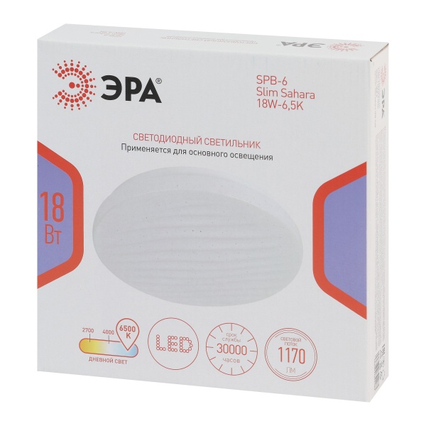 Светодиодный светильник ЭРА SPB-6 Slim Sahara — стильное и практичное решение для освещения жилых и коммерческих пространств. Компактный корпус размером 210x50 мм позволяет устанавливать модель даже в помещениях с невысокими потолками. Степень защиты IP20 предусматривает использование в сухих внутренних зонах.Рельефный плафон с эффектом «звёздного неба» придаёт светильнику выразительность и создаёт мягкую декоративную игру света, гармонично дополняя различные интерьерные стили. При мощности 18 Вт устройство формирует световой поток 1170 лм, обеспечивая достаточную яркость для повседневных задач. Матовый рассеиватель способствует равномерному распределению света без бликов и нагрузки на глаза.Цветовая температура 6500K создаёт комфортное нейтрально-белое освещение, подходящее как для работы, так и для отдыха. Светильник эффективно освещает площадь до 6 м2. Встроенные светодиоды отличаются экономичным энергопотреблением, стабильной работой без мерцания и длительным сроком службы — до 30 000 часов.Модель проста в установке, не требует дополнительного обслуживания и может использоваться в качестве основного либо дополнительного источника света. ЭРА SPB-6 Slim Sahara сочетает современный дизайн, надёжность и энергоэффективность, делая её универсальным выбором для квартир, офисов, торговых и подсобных помещений.