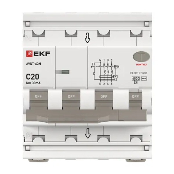 • Дифавтомат EKF PROxima АВДТ-63N 3P+N 20А 30мА характеристика C тип АС трехфазный электронный 6кА (дифференциальный автомат, АВДТ)