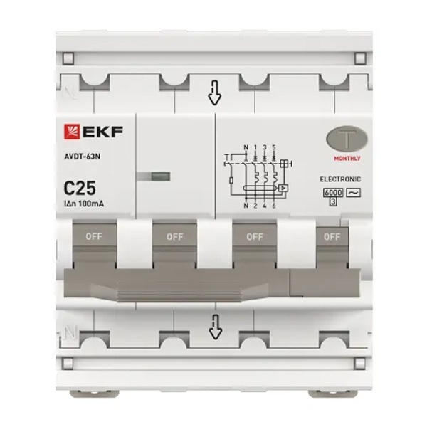 • Дифавтомат EKF PROxima АВДТ-63N 3P+N 25А 100мА характеристика C тип АС трехфазный электронный 6кА (дифференциальный автомат, АВДТ)