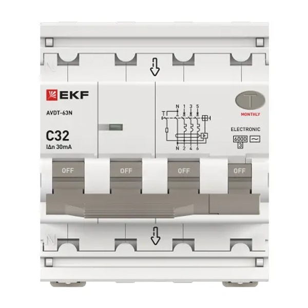 • Дифавтомат EKF PROxima АВДТ-63N 3P+N 32А 30мА характеристика C тип АС трехфазный электронный 6кА (дифференциальный автомат, АВДТ)