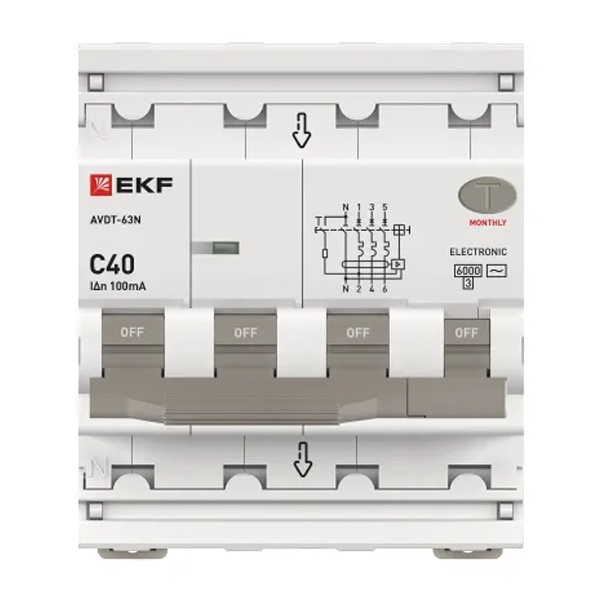 • Дифавтомат EKF PROxima АВДТ-63N 3P+N 40А 100мА характеристика C тип АС трехфазный электронный 6кА (дифференциальный автомат, АВДТ)
