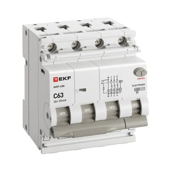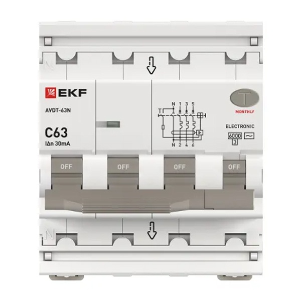 • Дифавтомат EKF PROxima АВДТ-63N 3P+N 63А 30мА характеристика C тип АС трехфазный электронный 6кА (дифференциальный автомат, АВДТ)