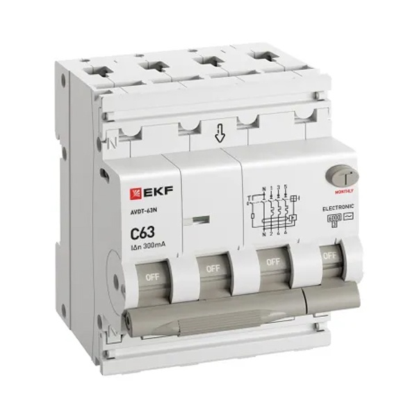 • Дифавтомат EKF PROxima АВДТ-63N 3P+N 63А 300мА характеристика C тип АС трехфазный электронный 6кА (дифференциальный автомат, АВДТ)