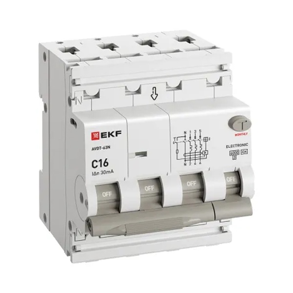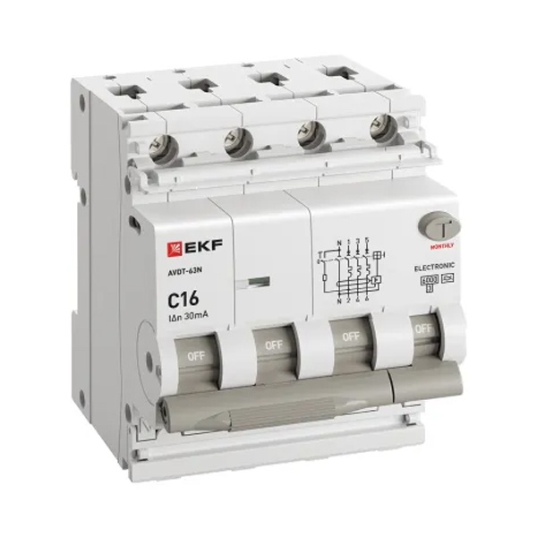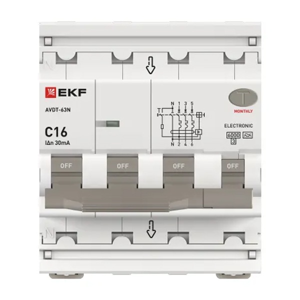 • Дифавтомат EKF PROxima АВДТ-63N 3P+N 16А 30мА характеристика C тип А трехфазный электронный 6кА (дифференциальный автомат, АВДТ)