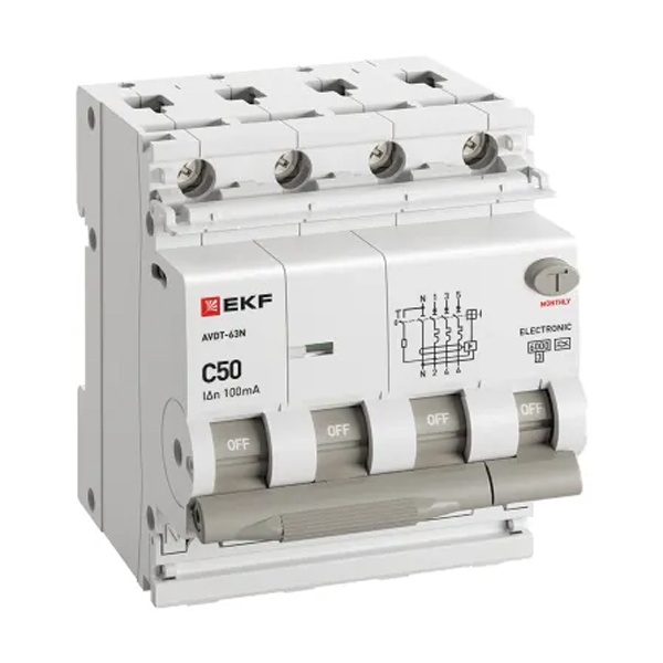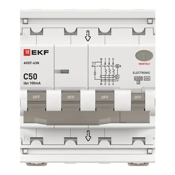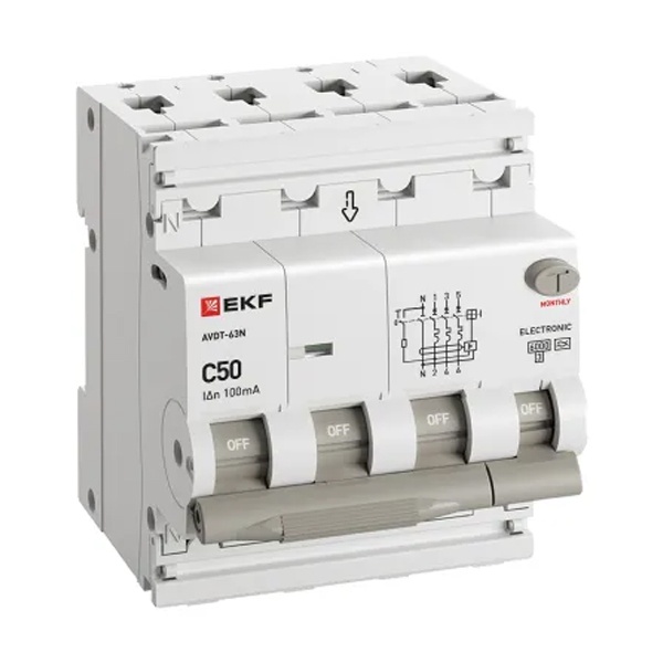 • Дифавтомат EKF PROxima АВДТ-63N 3P+N 50А 100мА характеристика C тип А трехфазный электронный 6кА (дифференциальный автомат, АВДТ)