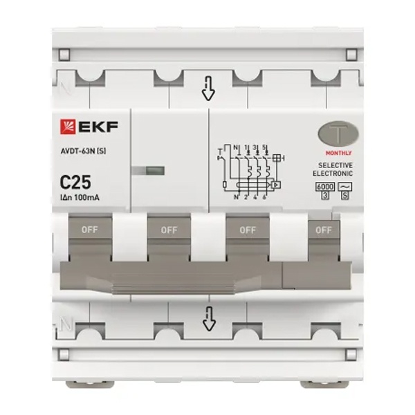 Дифавтомат EKF PROxima АВДТ-63N (S) 3P+N C25А 100мА тип АС трехфазный селективный электронный 6кА – это современное комплексное устройство защиты, совмещающее функции автоматического выключателя и устройства защитного отключения (УЗО). Предназначен для защиты трехфазных электрических сетей от токов короткого замыкания, перегрузки и утечек на землю, а также для предотвращения поражения электрическим током и снижения риска пожара.