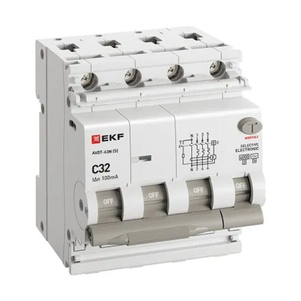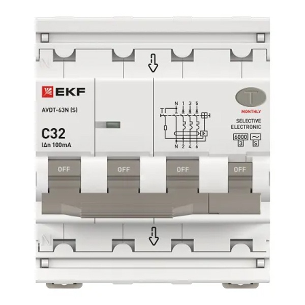 • Дифавтомат EKF PROxima АВДТ-63N (S) 3P+N C32А 100мА тип АС трехфазный селективный электронный 6кА (дифференциальный автомат, АВДТ)