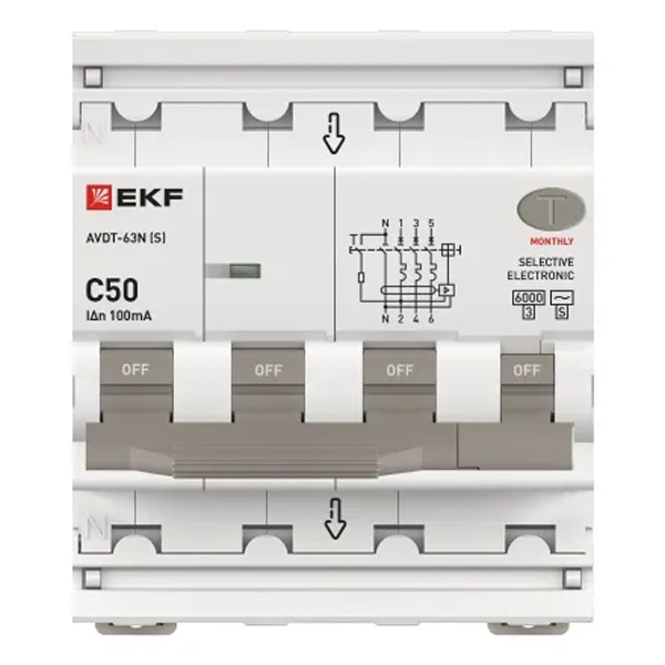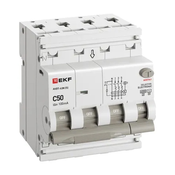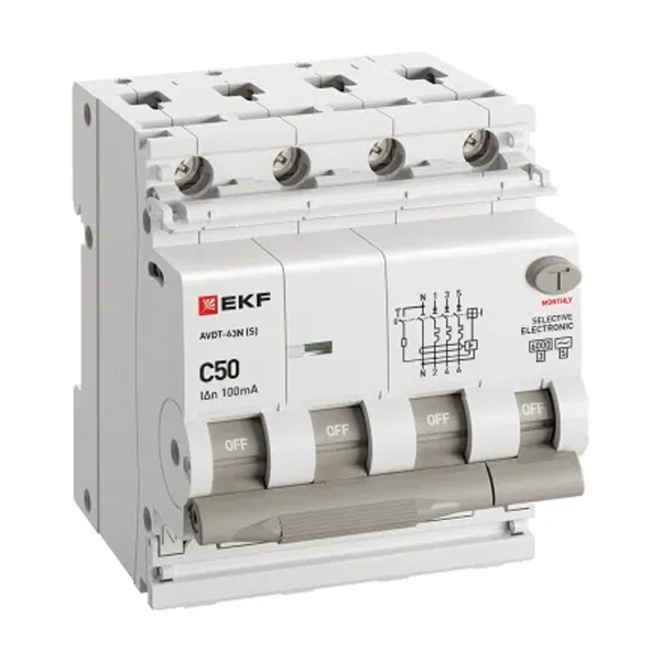 • Дифавтомат EKF PROxima АВДТ-63N (S) 3P+N C50А 100мА тип АС трехфазный селективный электронный 6кА (дифференциальный автомат, АВДТ)