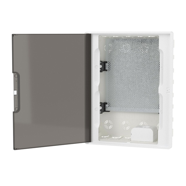Пластиковый распределительный шкаф DKC Frame скрытой установки с монтажной платой 24 модуля и 1 электрическая розетка, тонированная дверь F24B4WD