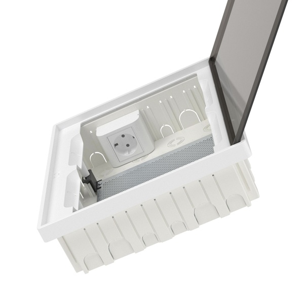 Конструкция щитка предусматривает съемную раму с монтажной платой, что значительно упрощает процесс установки и обслуживания. Монтаж и подключение оборудования могут быть выполнены заранее, вне ниши, после чего полностью собранный модуль легко устанавливается в основание щитка, встроенное в стену. Это обеспечивает удобство монтажа, сокращает время установки и повышает аккуратность выполнения работ.