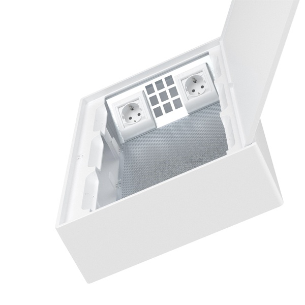 Монтажная плата оснащена специальными пазами для установки до 9 адаптеров формата Keystone, что обеспечивает гибкость при организации различных типов соединений (RJ-45, RJ-11, TV, HDMI и др.). Также установлены две розетки стандарта Viva, что расширяет функциональные возможности щитка.
