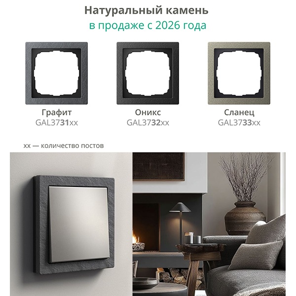 Материал отличается лёгкостью, стойкостью к царапинам и выразительным стеклянным блеском, благодаря чему рамка выглядит особенно аккуратно и подчёркивает геометрию выключателей и розеток.