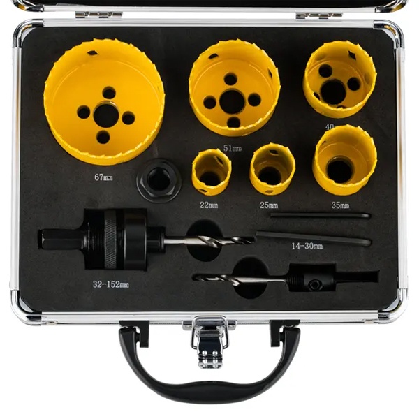 Все коронки набора изготовлены из высококачественной инструментальной стали, а зубья с переменным шагом 4–6 мм выполнены из быстрорежущей стали Р6М5К8 с добавлением 8% кобальта. Это повышает их термостойкость и долговечность, предотвращает перегрев и сохраняет остроту режущих кромок при интенсивной эксплуатации.
