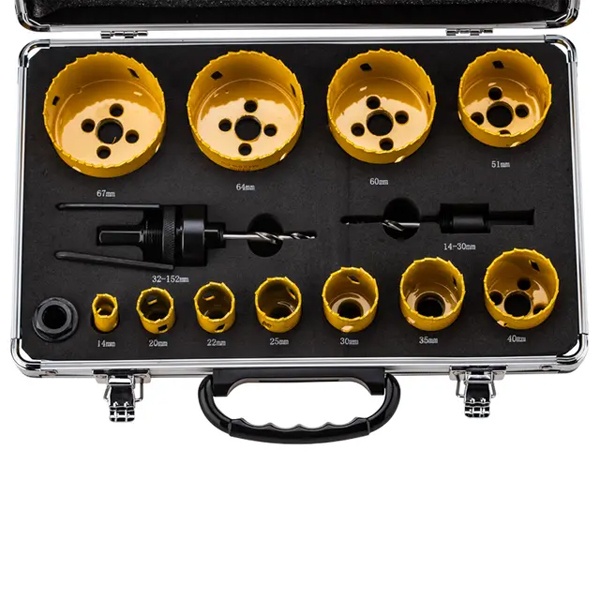 Все коронки набора изготовлены из высококачественной инструментальной стали, а зубья с переменным шагом 4–6 мм выполнены из быстрорежущей стали Р6М5К8 с добавлением 8% кобальта. Это повышает их термостойкость и долговечность, предотвращает перегрев и сохраняет остроту режущих кромок при интенсивной эксплуатации.