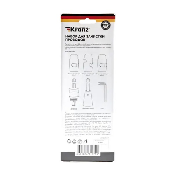 Универсальный набор предназначен для быстрой и эффективной зачистки электрических проводов с использованием ручной электродрели или шуруповёрта. Он оптимально подходит для работы с наиболее распространёнными сечениями проводов - 2,5 мм2, 4,0 мм2 и 6,0 мм2, что делает его практичным решением как для бытовых, так и для профессиональных электромонтажных задач.